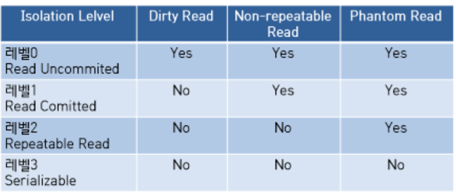 가장 낮은 isolation 레벨 0의 경우 lock이 걸리지 않기때문에 속도는 매우 빠르나 동시 접근을 허용하기때문에 데이터 정합성에 문제가 생길 수 있고, 반대로 가장 높은 레벨3의 경우 완전히 lock을 걸어 동시 접근을 차단하고 순차적으로 처리 (serializable) 하기 때문에 원자성은 완벽하지만 동시에 처리 할 수 있는 양이 적어 속도가 매우 느립니다.